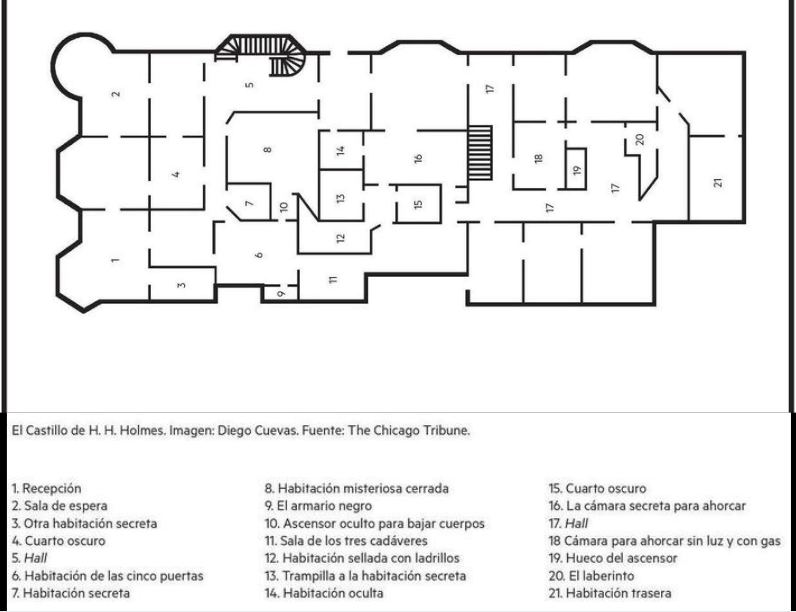 El arquitecto era H. H. Holmes y la construcción pasó por decenas de manos distintas, que nunca tuvieron constancia completa de la forma ni el propósito del edificio. Porque el edificio se había diseñado meticulosamente con una única voluntad.