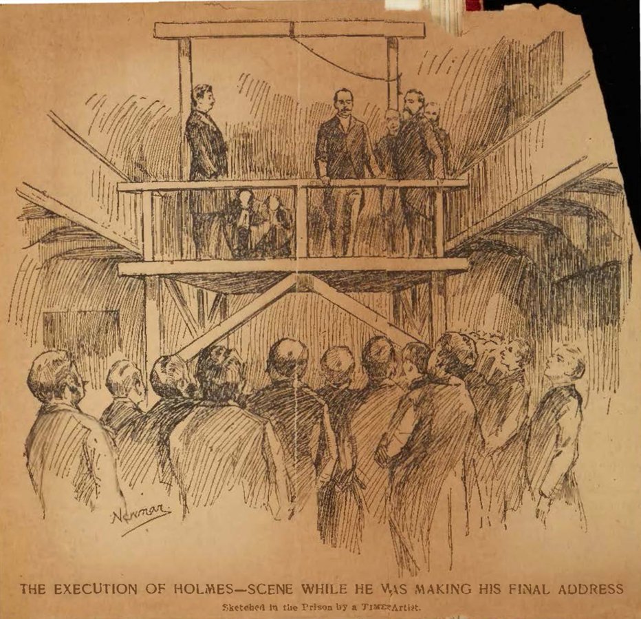El 7 de mayo de 1896, H. H. Holmes, cuyo verdadero nombre era Herman Webster Mudgett, fue ejecutado por ahorcamiento en la prisión de Moyamensing, Pennsylvania. Tenía 34 años.