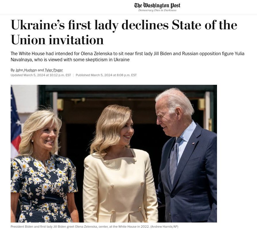 Olena Zelenska declined an invitation to attend Joe Biden's address to the nation because they wanted her to sit next to Yulia Navalnaya.