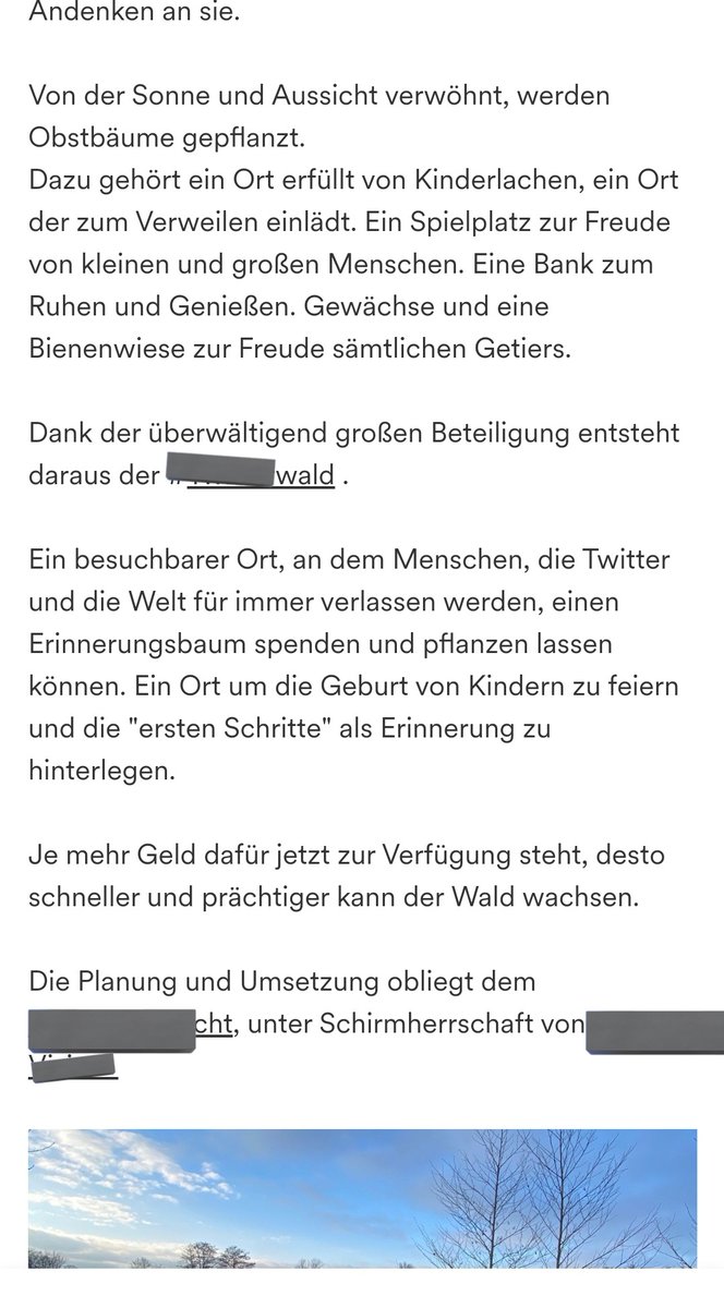 Das Gelände gehört einem Twitterer und alle Bäume, alles was gespendet wurde gehört dann ihm.