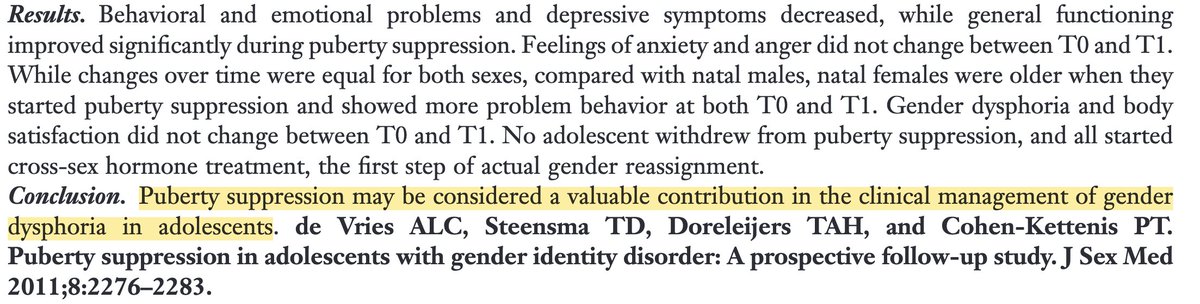 The original conclusions of the Dutch research in 2011/2014 claimed modest improvements in mental health of gender dysphoric minors following puberty blockers. The study's actual conclusions were quite modest yet they launched the practice of youth gender transitions worldwide./2