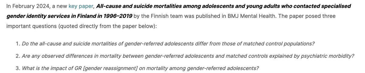 The study posed 3 questions about gender-dysphoric patients <23 yrs old: 1. Does the GD patients’ mortality rate, incl. suicide, differ from the control population? 2. Are the differences explained by psychiatric illness? 3. What’s the impact of gender transition on mortality?/3