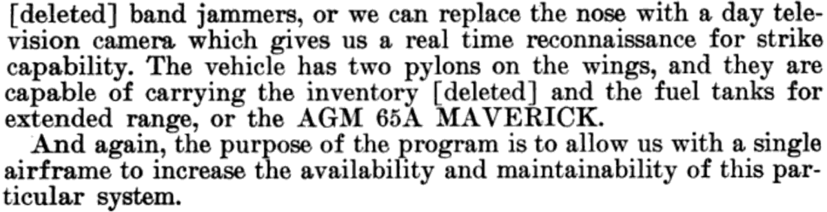 The first model, BGM-34A, began flight tests in 1971. It could be armed with Mavericks, as seen in the first image, or AGM-45 Shrikes, such as this example.