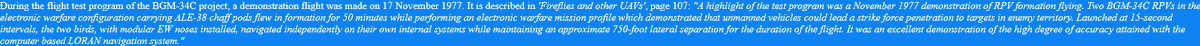 BGM-34C (Model 259), which began testing in 1976, allowed for interchangeable "mission modules." The first contained a KS-10A strike camera, and the EW section likely contained deception jammers that operated in Soviet SAM bands to provide a SAM-free corridor for strike aircraft.