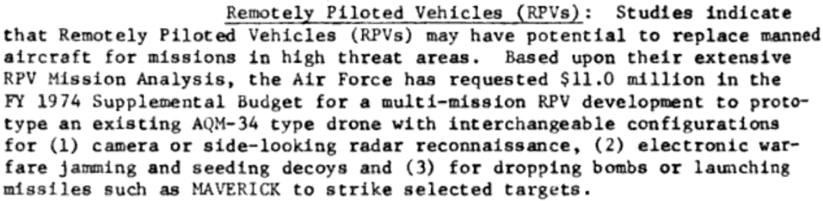 Sources vary on why funding dried up. Some claim that it was deemed unnecessary after the end of the Vietnam War, and others claim that Tactical Air Command leadership saw it as a "threat" to manned vehicles. Either way, the program would never make it into production.