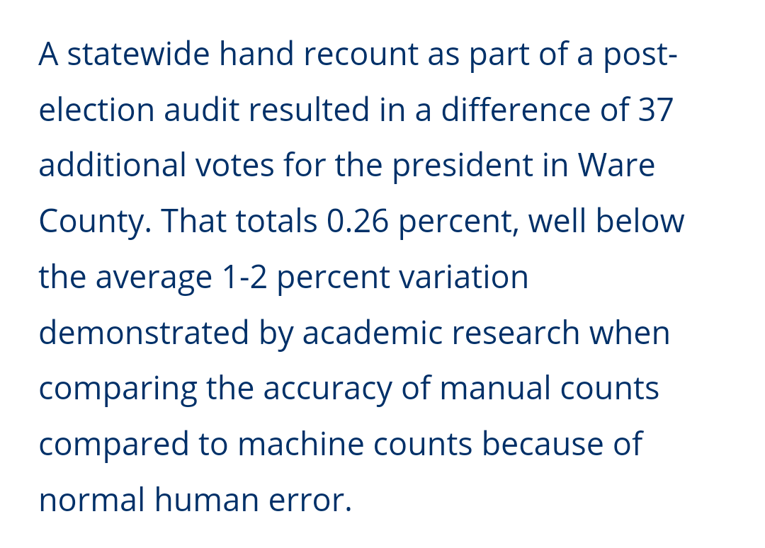 In Dec 2020 some suspected that Ware votes had flipped based on adjusted Trump/Biden totals in the hand count. Trump gained 37 Biden lost 37. While this was suspicious, no specific evidence was found.