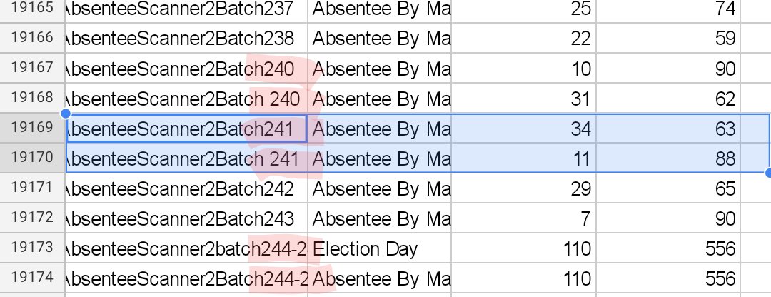 While Alex Halderman testifies that it's possible to cheat using this voting system, let's look at actual evidence from 2020 that I discovered a few days ago. This is another potentially flipped batch. I say potentially because missing records prevent confirmation.