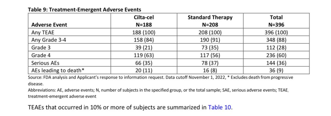 If you are able to get your Cilta cel, the risk of death in the first 3 months is 5% , most of those deaths (4%) were related to adverse events. Given the study was done in COVID era, some of the deaths were related to that infection so the risk maybe lower nowadays-esp USA