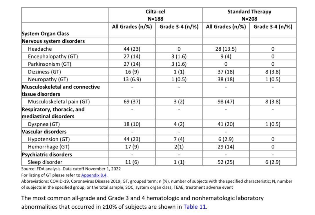 When you get Cilta-cel, the more serious adverse event (grade 3 or 4) are common with one to 2 thirds of patients will have some , most resolve with time though it may require longer F/U(months) and blood transfusions, infections , hospitalizations,need for stem cell support