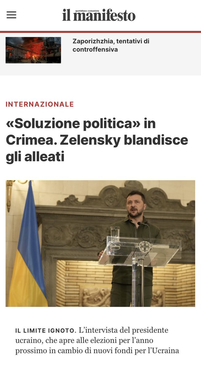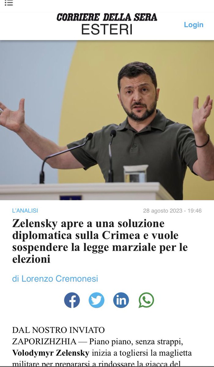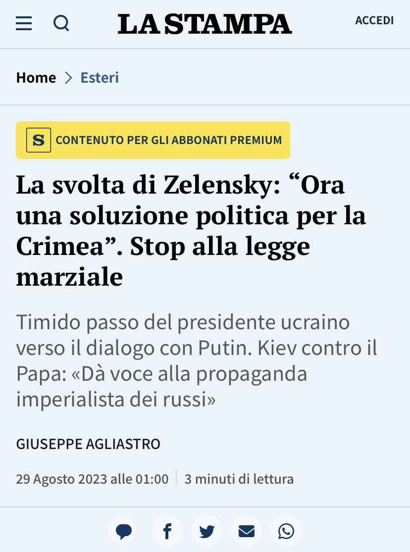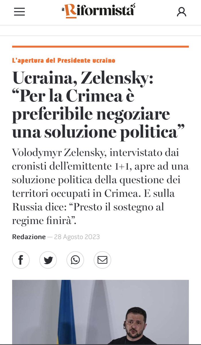 Guardate i titoli sottostanti delle principali agenzie e quotidiani italiani. Tutti più o meno dicono la stessa cosa: "Zelensky pronto a negoziare sulla Crimea". Stranamente alcuni analisti che sono immuni a questo tipo di disinformazione ci hanno creduto e hanno cominciato a /2
