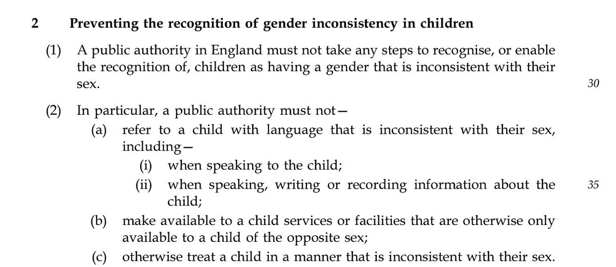 5. Another provision sought to ban social transition in schools, even if a parent approves. It states that "public authorities" would be banned from "treating a child in a manner inconsistent with that child's sex."