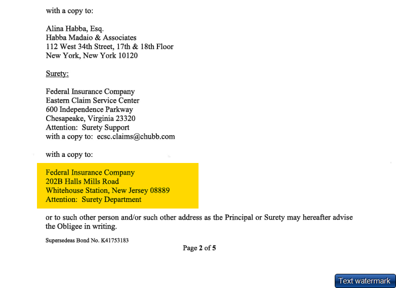 One thing I never do is underestimate a known fraudster. Here's the address of the surety on Trump's Supersedeas bond.