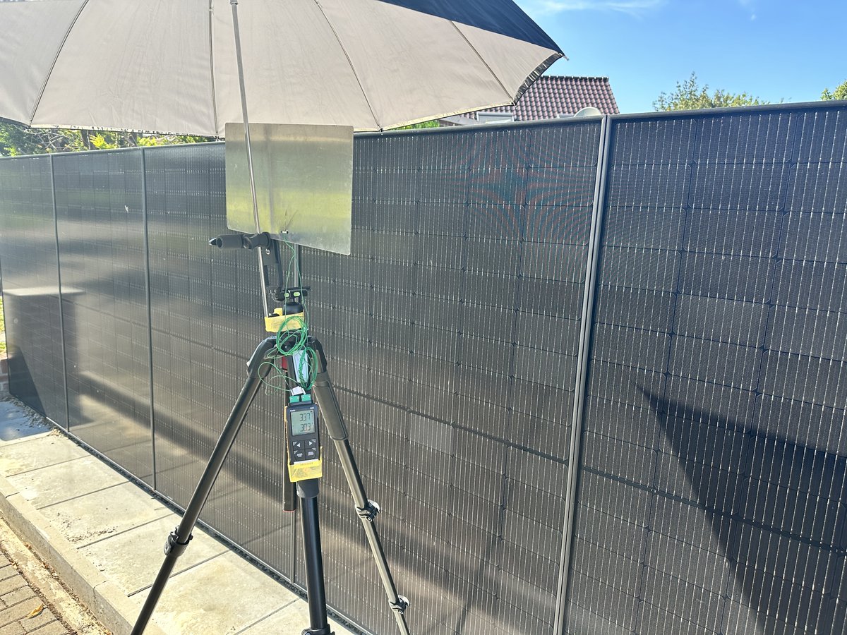 Einfluss des Zaunes bzw. Hecke zu messen. Jeweils 30 Min. einschwingen lassen und dann messen. Der Nachbar hat genau in Zaunverlängerung von mir eine Hecke stehen. Also 2x Lufttemperatur gemessen und je einmal in 50cm Anstand von der Hecke und den PV- Modulen.