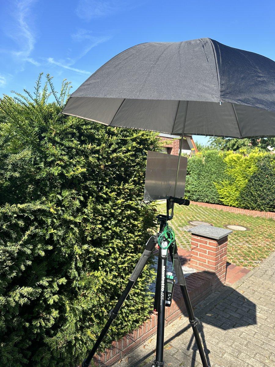 Dazu habe ich einen kleinen Messaufbau vorbereitet. Einmal ein mit Wärmeleitkleber auf ein Alublech aufgeklebtes Thermoelement, dass zu Zaunseite schwarz lackiert wurde und auf der abgewandten Seite einen 2. Fühler in freier Luft. Das Ganze unter einem Schirm um nur den