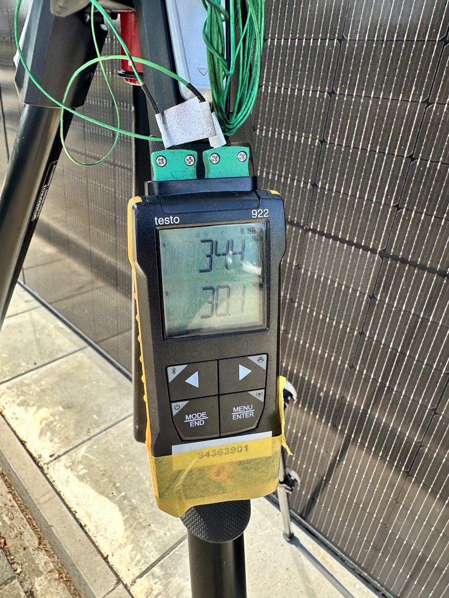 Nachdem ja einige meinten, dass man sich nun beim Vorbeigehen aufgrund der heißen Module verbrennt. Schließlich wurde irgendwo im Internet gelesen, dass die Module bis zu 80°C erreichen können. Nun hatten wir ja mal endlich 30°C, windarm und Sonnenschein und ich konnte messen!