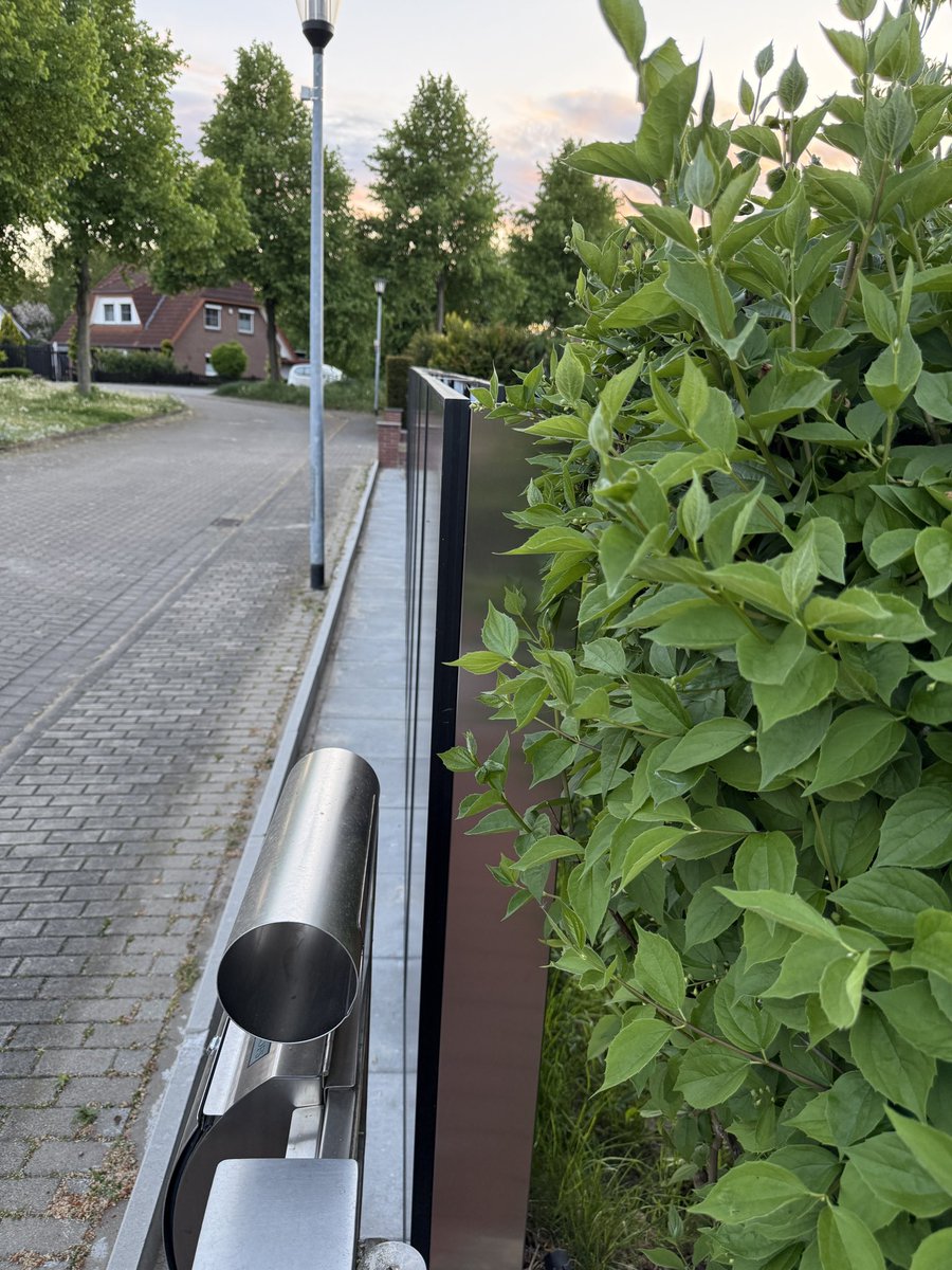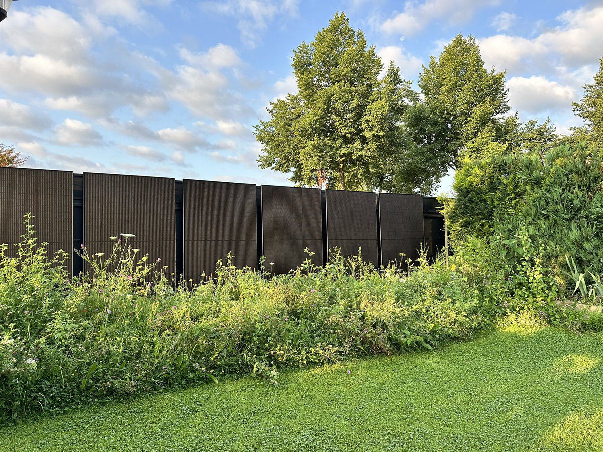 Die Front ist komplett glatt und geschlossen. Höhe 1,8m. Die hier noch offene Stirnseite wird noch mit einem schwarzen, angepassten Profil verschlossen. Vorher stand hier eine Eibenhecke, die über die Jahre zu groß geworden ist. Die Ausrichtung ist fast genau Süd.