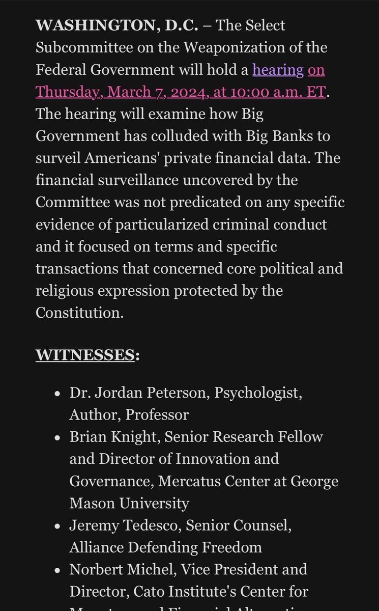 Per House GOP: this hearing will focus on “how big government has colluded with big banks to surveil Americans’ private financial data….”