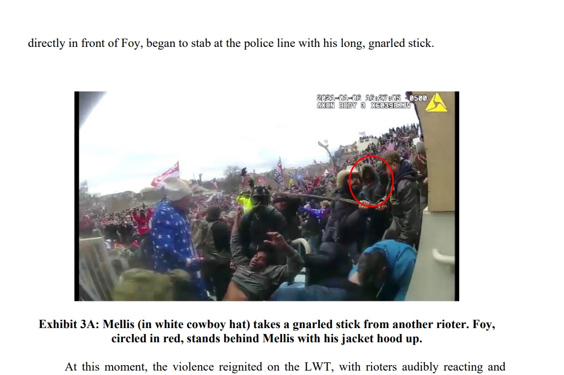 NEXT HOUR: Sentencing in Capitol riot case of Michael Foy. Justice Dept seeks approx. 8-years prison. Their argument to court includes images of Foy trying to "stab at police with his long gnarled stick" and "throwing a sharpened metal pole"