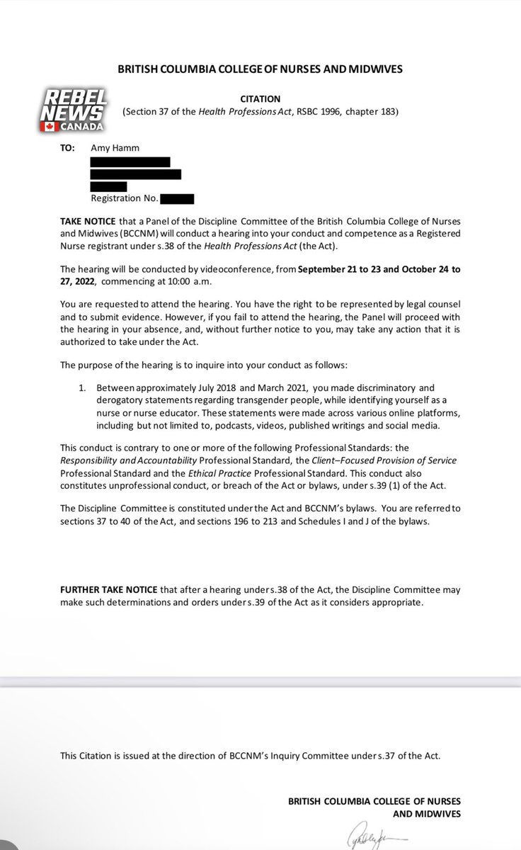 34) It’s important to note that after the initial anonymous complaint was made against Hamm for her off duty role in a “I❤️ JK Rowling” billboard msg in Vancouver, the BCCNM originally charged her with charge of spreading “medically inaccurate information” rebelnews.com/i_heart_jk_row…