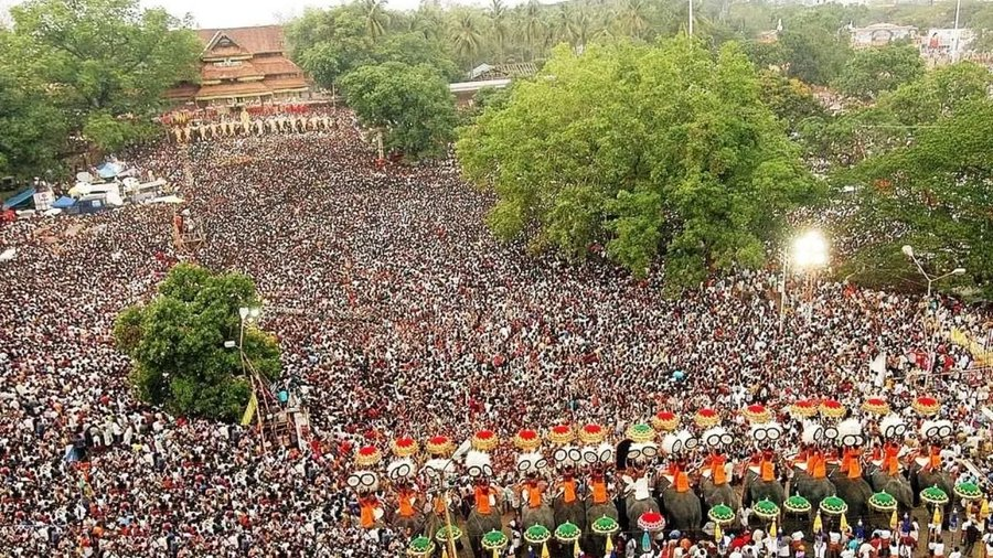 The Pooram event in Thrissur (kerala) features a stunning spectacle of over 50 decorated elephants adorned with nettipattam (golden headdress), intricately crafted Kolam, ornate bells, and other ornaments.