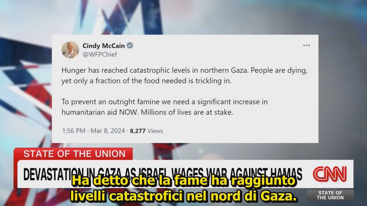 Dana Bash tenta di spiegare che il problema non è la guerra in sé, ma la crisi umanitaria determinata dalla scarsità di aiuti che riescono ad entrare