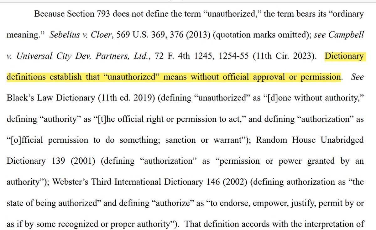 This is the best Jack Smith could do in defining "unauthorized" to meet language in Espionage Act. Since no former president has ever been prosecuted for this--another point repeatedly raised by Cannon--DOJ has no historical precedent to argue an outgoing president cannot confer "authority" on himself for possessing NDI papers.