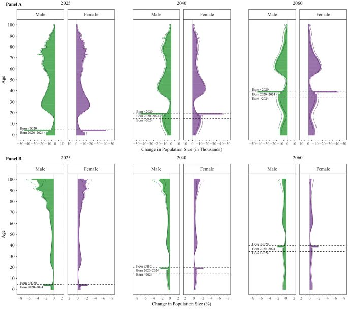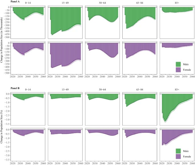 2) Fig. Difference in Population Size, by Age Group and Sex.