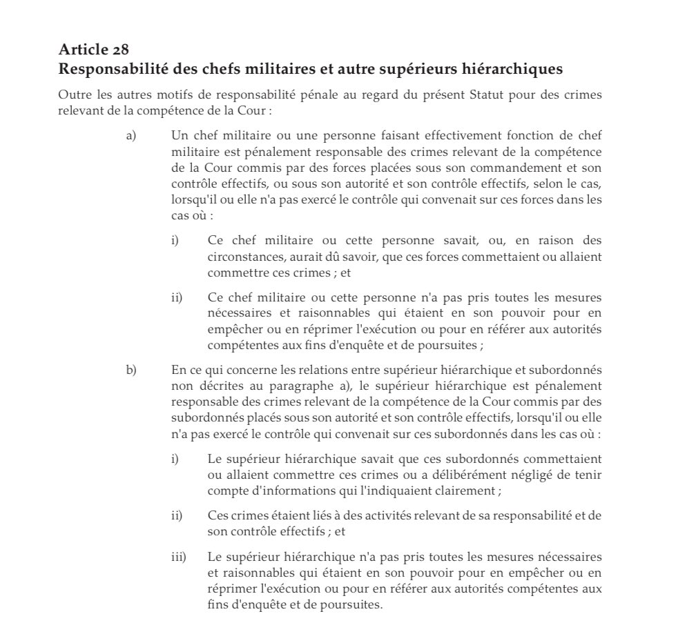 Les Conventions de Genève, le Statut de la CPI et le droit international coutumier (Règle 158) exigent de la France d'enquêter sur « les crimes de guerre potentiellement commis par ses ressortissants ». 👇
