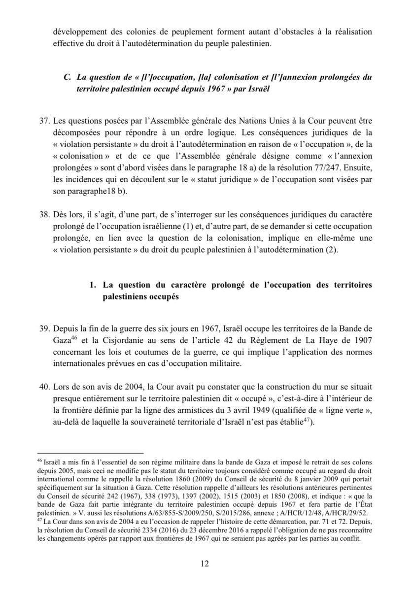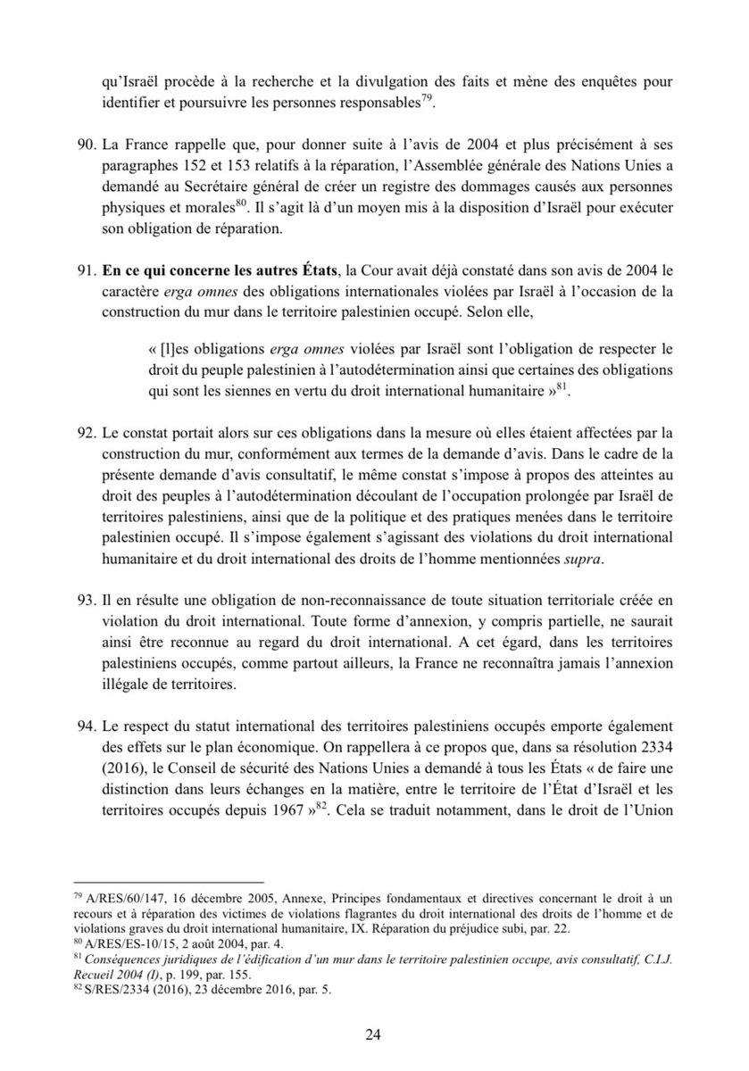 20. Il est donc paradoxal de considérer, comme le fait le porte-parole de @francediplo, qu'il n'y a aucun indice laissant supposer que des Français aient pu participer à des crimes en Palestine, alors que la France reconnait elle-même que l’occupation permanente est un crime.