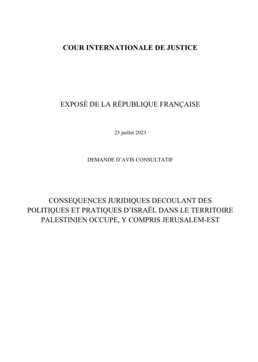 19. De plus, dans son mémoire à la CIJ, la France a souligné que l'occupation israélienne de Gaza et de la Cisjordanie constituait “une violation du droit humanitaire” et qu'il est du devoir de tout État “de ne pas assister au maintien d'une situation contraire au droit international” et “de faire respecter le droit humanitaire international”.