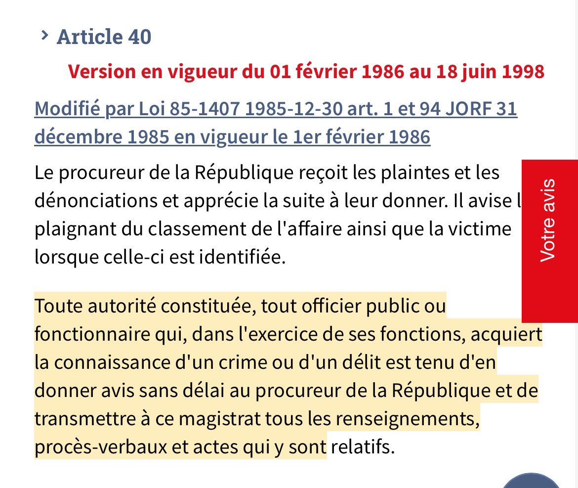 @francediplo 21. Rappelons, en outre, que l'article 40 du Code de procédure pénale exige de « toute autorité ou fonctionnaire qui, dans l'exercice de ses fonctions, acquiert la connaissance d'un crime ou d'un délit, d'en informer sans délai le procureur de la République ».