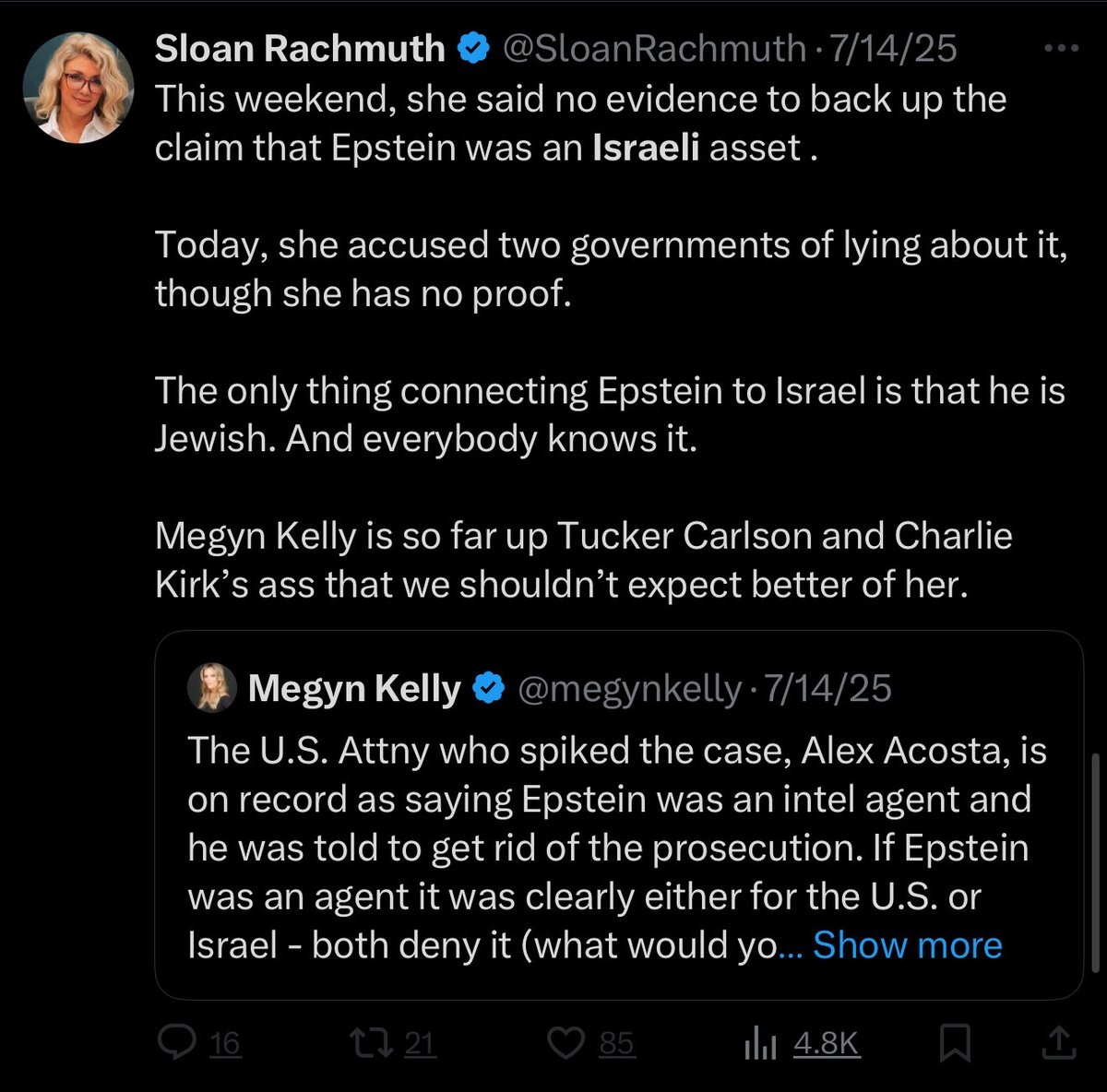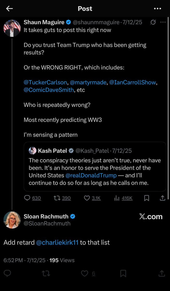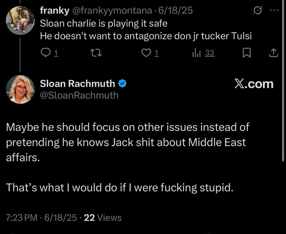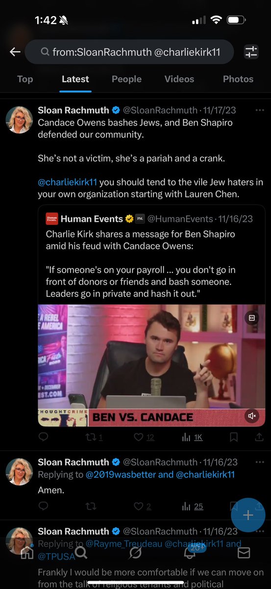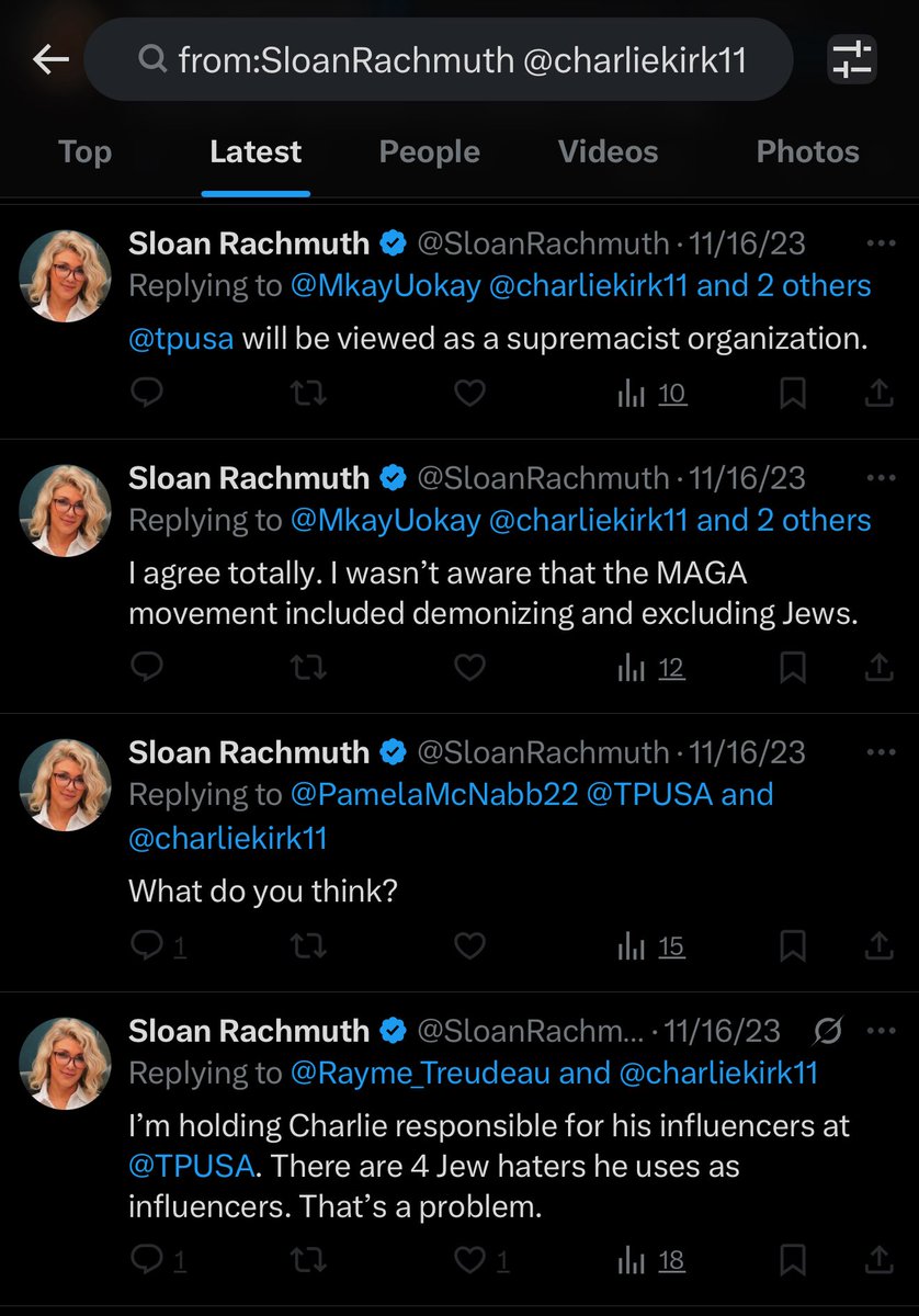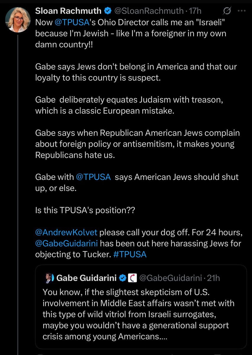 Sloan Rachmuth, who deleted (almost) every tweet she ever made about Charlie Kirk before he was murdered, is now harassing @GabeGuidarini for pushing back on her demands that TPUSA cancel Tucker Carlson.