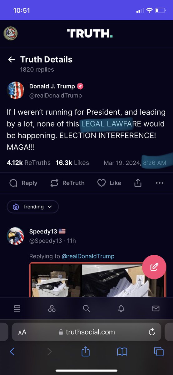 DJT Truth? All over his posts in the morning, some folks even referenced lawfare in comparison to warfare.