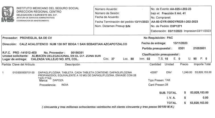 Y aquí podemos ver un documento del IMSS bajado de los contratos en Compranet, donde se especifica que el 13 de noviembre de 2023, el IMSS en CDMX le compra a Proveglia 43097 unidades de dapagliflozina, por un total de 58 millones de pesos.