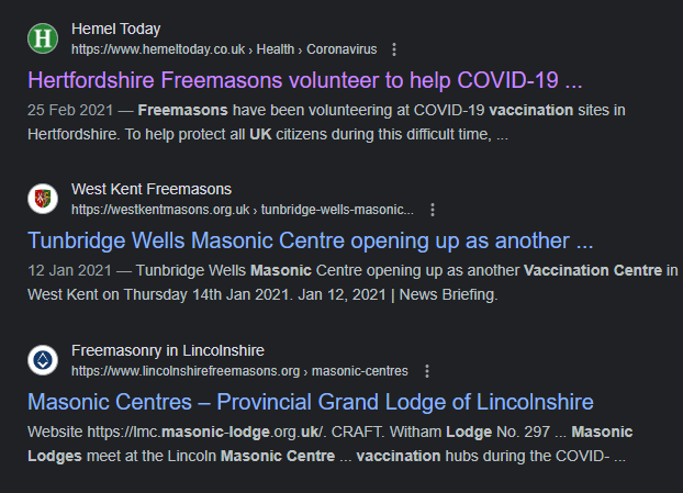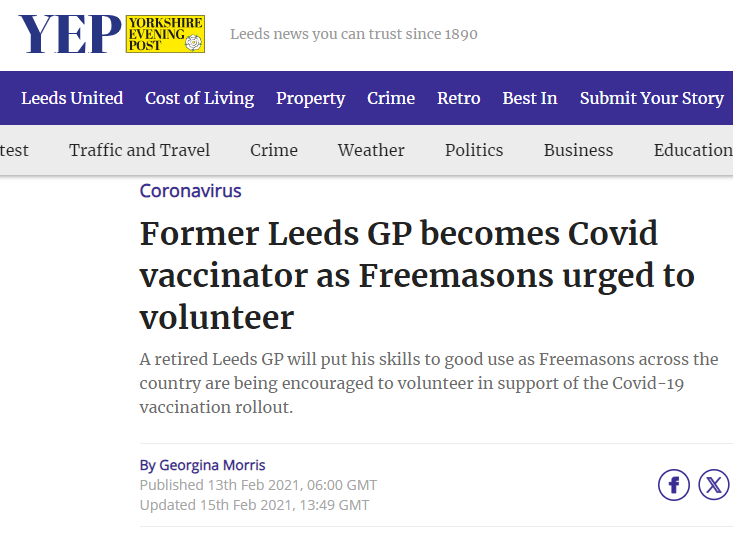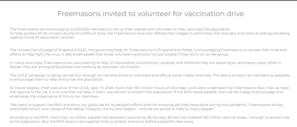 "In many provinces, Freemasons are volunteering to help. In Devonshire, Lincolnshire, Leicester and Wiltshire they are assisting at vaccination sites, while in Dorset they are driving ambulances and working as volunteer vaccinators."