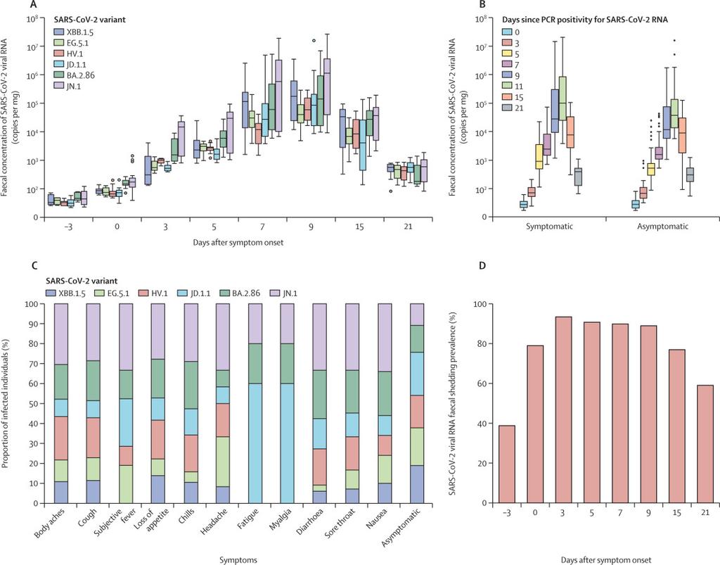 Fig. Faecal shedding and symptoms data for 113 individuals infected with XBB.1.5 (n=19), EG.5.1 (n=18), HV.1 (n=18), JD.1.1 (n=17), BA.2.86 (n=16), and JN.1 (n=25)