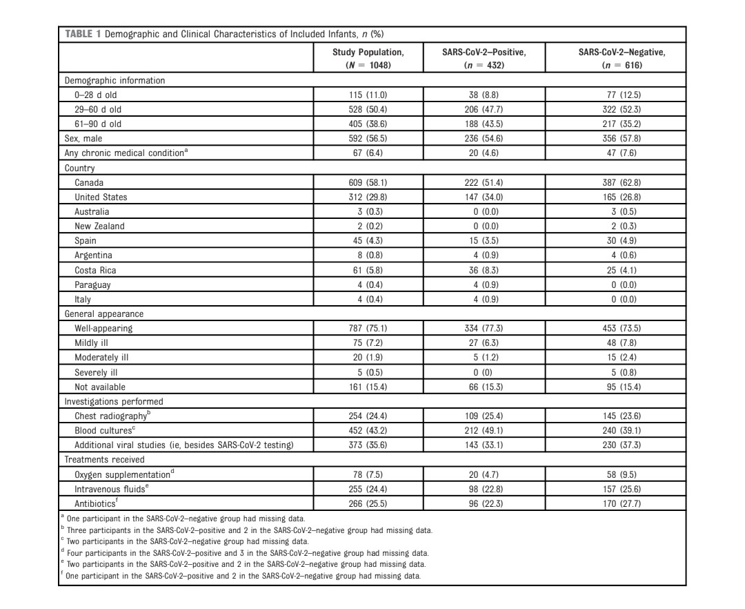 "Among 1048 infants tested for SARS-CoV-2, 432 (41.2%) were SARS-CoV-2โpositive and 616 (58.8%) were SARS-CoV-2โnegative.