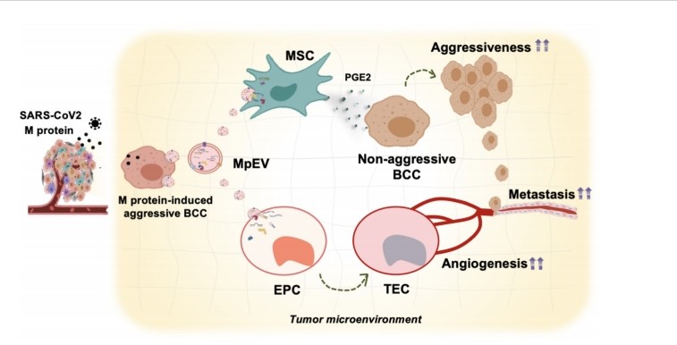 2) "Our previous study reported that the SARS-CoV-2 membrane protein (M-protein) promotes the malignant transformation of triple-negative breast cancer cells (triple-negative BCC)."