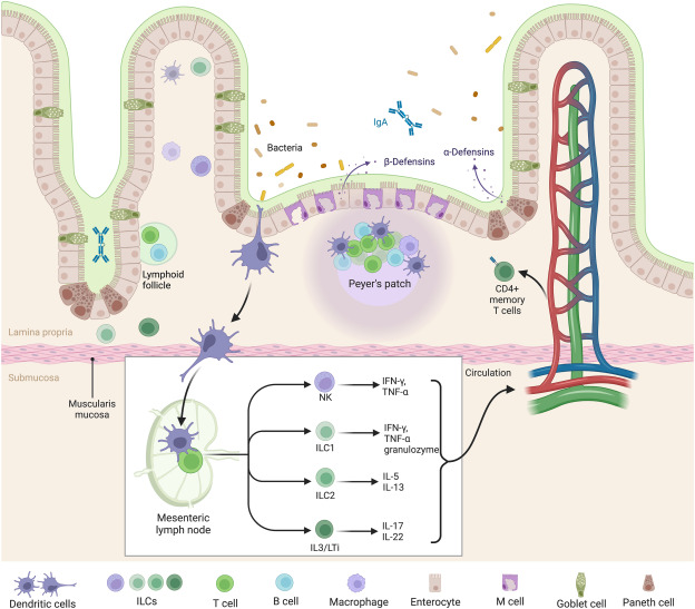3) Fig. Immune crosstalk of gut-lung axis. Immune cells such as DCs and lymphocytes are activated by intestinal microbes and enter lymphatic and blood circulation through mesenteric lymphatics and portal vein system, and finally enter the lung to play an immunomodulatory role.