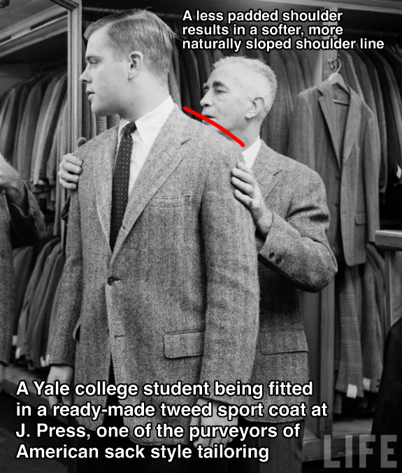 First, it had a much softer shoulder. British tailoring firms such as Huntsman are known for their stiff, built-up shoulders, but the sack suit features a softer, more natural shoulder line, making the wearer look more casual and relaxed.