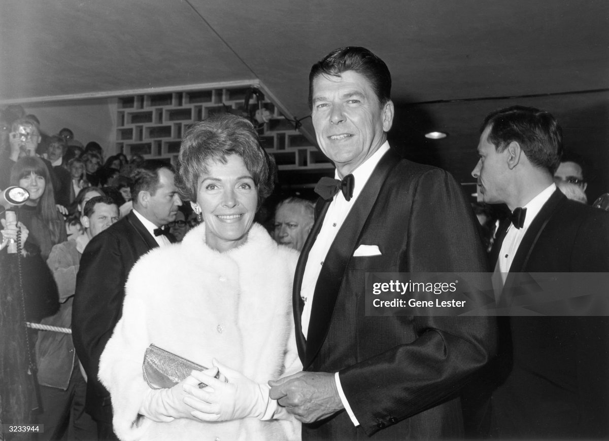 1960s. Poitier in white tie (again, rare today). Reagan in a shawl-collar dinner suit with an Ivy styled two-button cuff. Pollard in a ruffle collar. Peck in a classic American-styled dartless tweed, oxford button-down, and green knit tie. Not seen: single-monk shoes. Fantastic