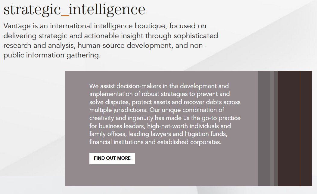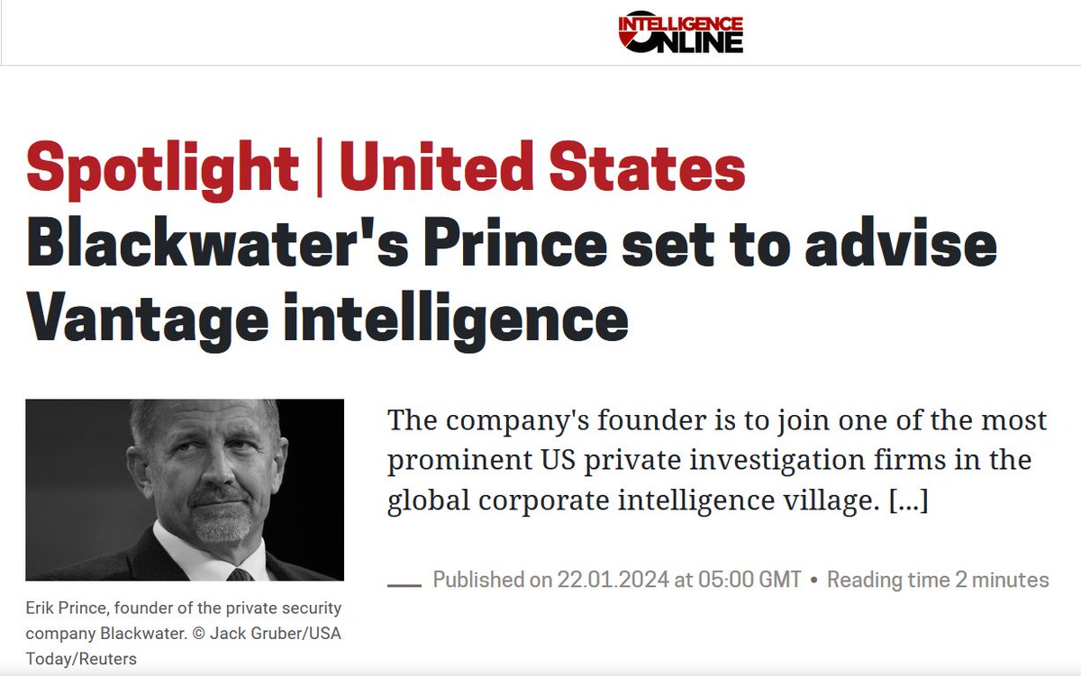 In late January Erik Prince joined the advisory board of Vantage Intelligence which has offices in London, New York and Dubai. Vantage website: vantageintelligence.com