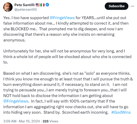 Pete Santilli, a man who has been jailed during police stand-offs & an alleged FBI informant who may have played a role in getting a Lavoy Finnicum killed, is being used to intimidate me. TWC co-owner Foster Coulson encourages Pete's veiled threats.
