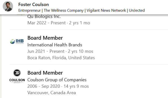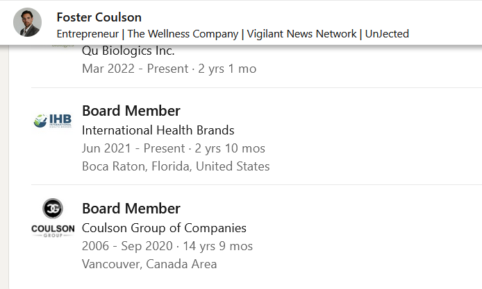 Whether he's in the family photo or not, Foster's LinkedIn states that he remains on the Board of the Coulson Group. (screen cap recorded today)