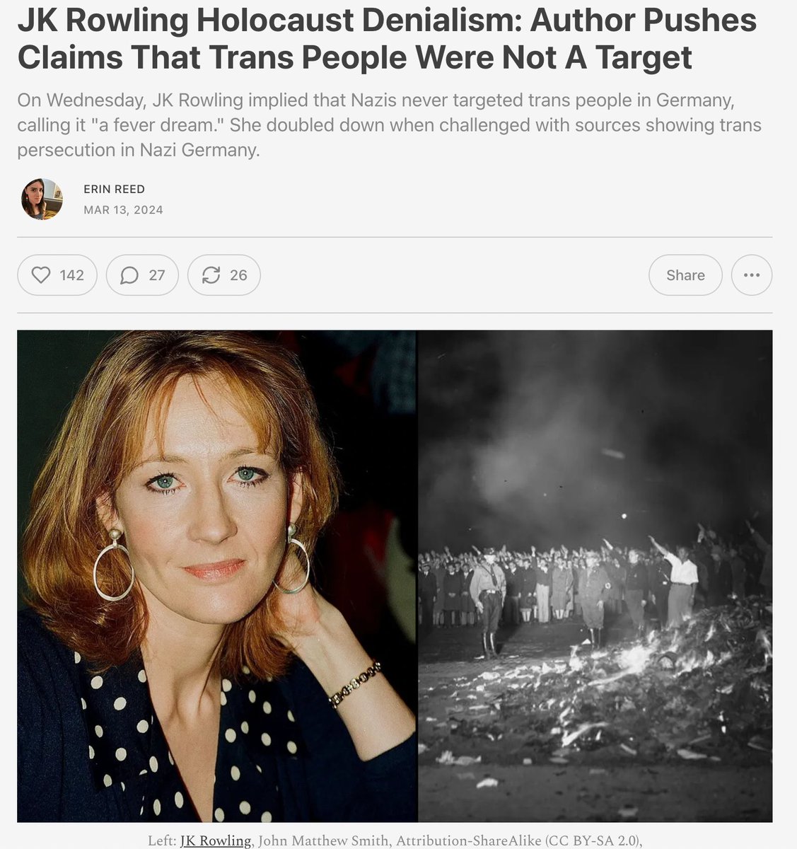 2. Rowling originally compared trans people targeted by the Holocaust to "a fever dream." When confronted with sources, she linked to a thread calling the first trans woman to receive gender reassignment surgery "a troubled male," which also denied it.