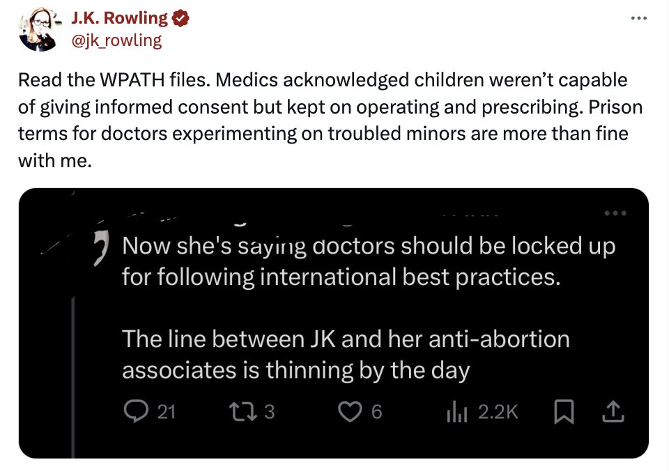 3. The claims and denialism came shortly after she called for the arrest of doctors providing gender affirming care, as well as leaders from Stonewall and Mermaids.
