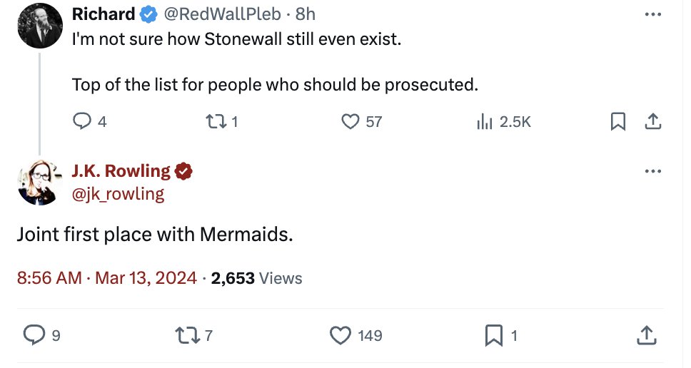 1. Today, JK Rowling promoted holocaust denialist views, claiming that the trans people targeted and books burned during the rise of fascism was "a fever dream." She also called for the arrest of Stonewall, Mermaids LGBTQ+ leaders.