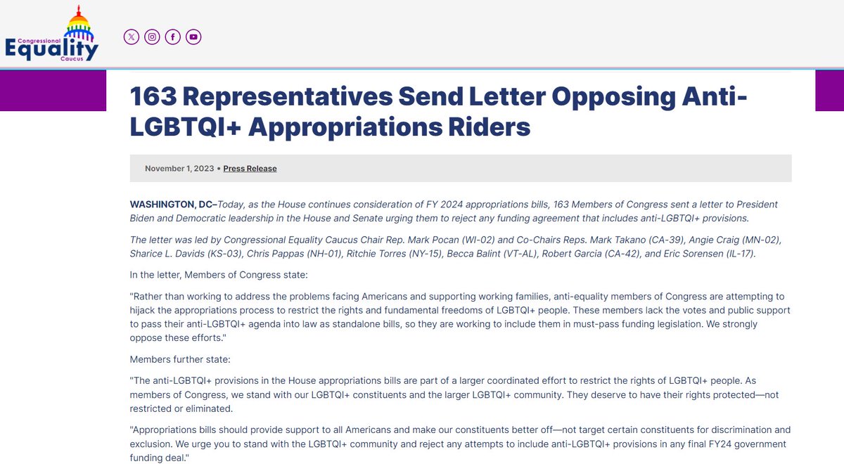 12. I was anticipating, when the national budget came out yesterday, that at least a handful of Democrats would budge on a major anti-trans provision. There were over 40 according to the Congressional Equality Caucus, of which 168 Dems signed a letter opposing the riders.