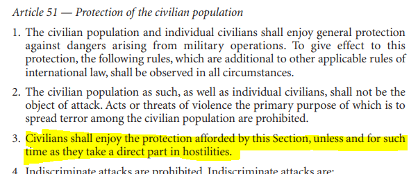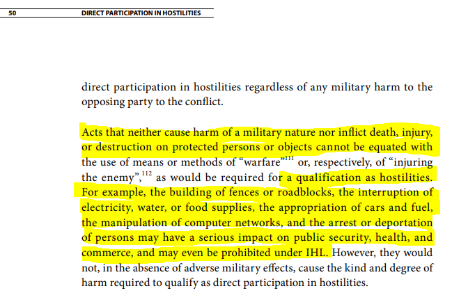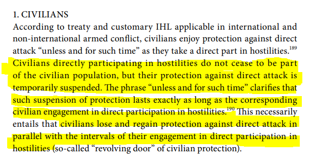 According to the @ICRC, "direct" participation requires 1) a minimum threshold of harm, 2) a direct causal link between that harm and the act in question, and 3) a belligerent nexus. Let's look into them one by one (and for more info, see here: ) icrc.org/en/doc/assets/…