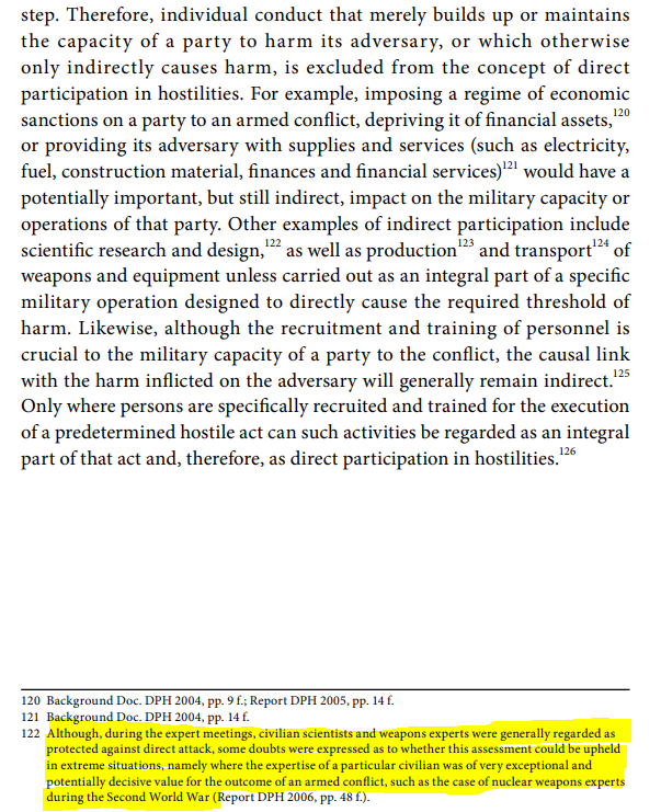 Here there is an interesting case to analyse: usually, civilian researchers are also considered "indirect" participation. But what about Oppenheimer or Turing during WWII? Was their research "indirect"? Or "direct"? Experts disagree. Per the ICRC: